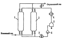 Процесс адсорбции является наиболее эффективным способом. Эффективность протекания адсорбционных процессов при осушке определяется многими факторами, и, в первую очередь, это характеристики используемого твердого адсорбента. Как правило, адсорбционные процессы в установках осушки газов являются периодическими. Адсорбер, наполненный адсорбентом, является главным звеном в схеме данного процесса и после насыщения адсорбента парами воды переключается на стадию десорбции (регенерации). При этом цикл работы адсорбера может проходить через ряд дополнительных стадий, таких как изменение температуры адсорбента, его замену, изменение давления газа, проходящего через него.